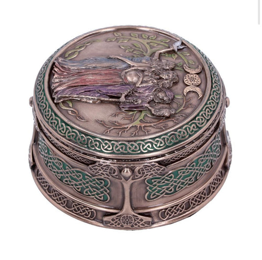 Bronze Maiden Mother Crone Triple Moon Pagan Trinket Box 9.5cm | Deity | Goddess | Moon | Witchcraft | Wiccan | PaganPagan Triple Moon Goddess Box.Representing the cycle of life and rebirth.Cast in high-quality resin.Painstakingly hand-painted. Keep your most treasured belongings...