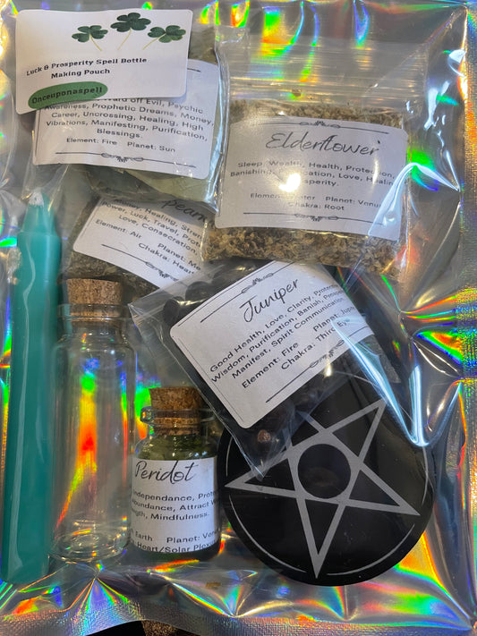 Luck and Prosperity Spell bottle Making Kit | Money Spell | Wealth | Luck | Prosperity | Pagan | Witchcraft | WiccanThis kit contains the perfect materials for a Luck and Prosperity spell bottle. 1 Green spell candle1 spell candle holderSpearmintJuniper...