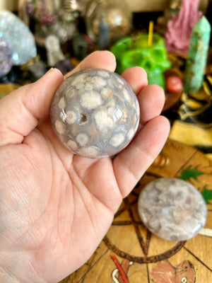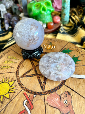 Flower Agate Sphere on Stand and Palm Stone Gift Set | Crystals | Witchcraft | Wicca | Pagan | Healing | Reiki | Chakra | Ornament | Ball