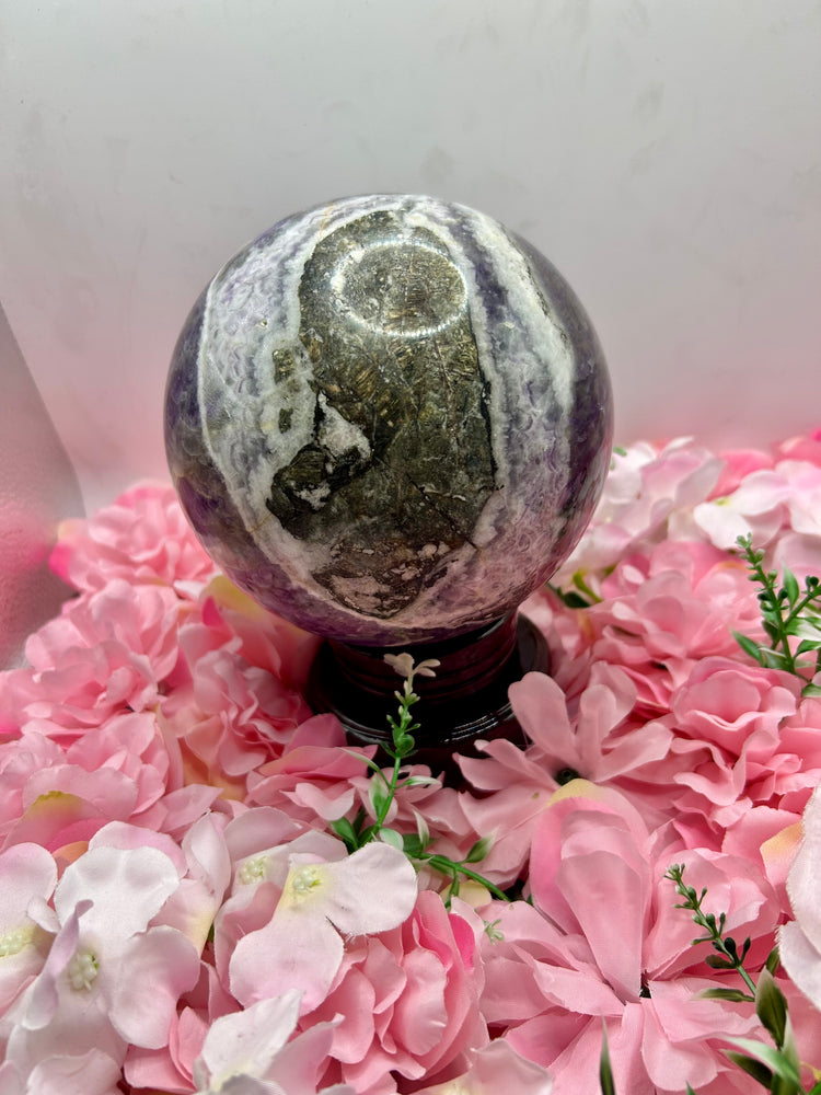 Mesmerizing, powerful, and full of calming energy. This stunning sphere comes with a wooden rotating stand so you can admire every swirl of purple magic. 💜🔮