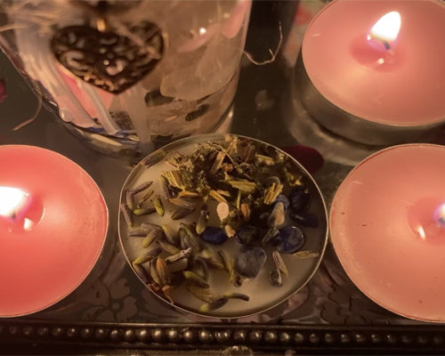 1 x Lovingly Handmade Lucid Dreams Tea-Light Spell Candle made with herbs and crystals that will aid Lucid Dreaming
