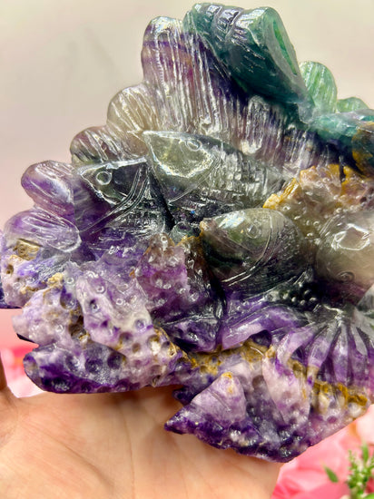 Ocean themed rainbow fluorite crystal carving 1kg 14cm