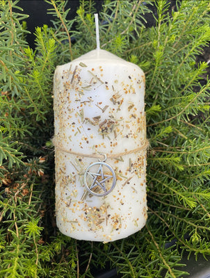 13cm Pillar Candle Rolled in the best herbs for cleansing, purifying & spreading Positive vibes. 45 hour burn time.