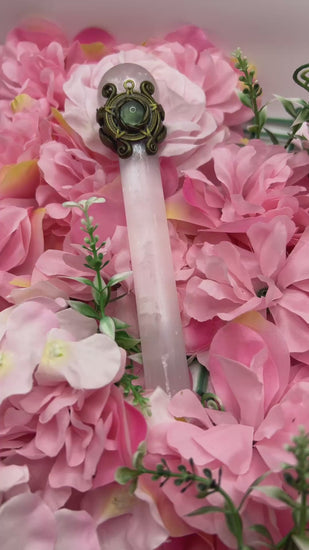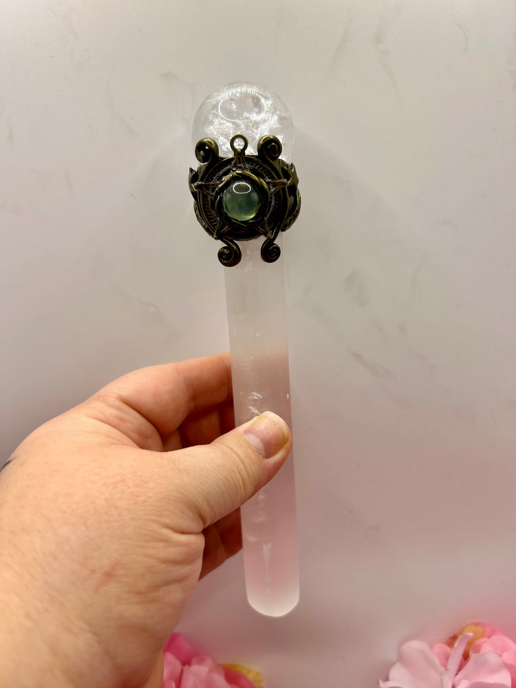 This stunning hand-crafted wand features a polished selenite body topped with a clear quartz sphere that has rainbow flash and a decorative bronze setting holding a green-hued accent stone. Beautiful for both energy work and display! 🌿💫