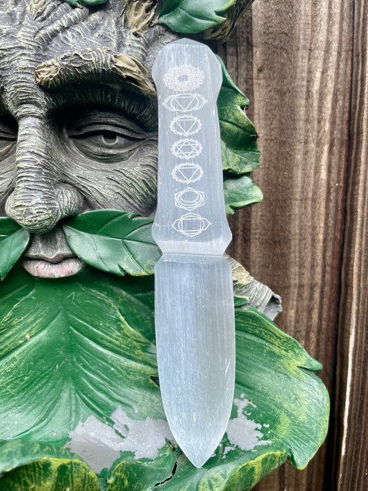 Selenite Ritual Knife - Chakra | Selenite Wand | Ceremonial | Altar | Crystals | Witchcraft | Wicca | Pagan | Magical knife | Gift | AthameChakra Selenite Ceremonial/Ritual Knife Laser engraved These objects are both decorative, but they have a strong esoteric meaning. Selenite knives...