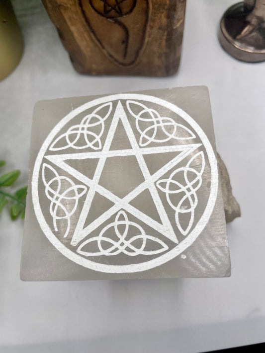 Hand Made Laser Engraved Pentagram Selenite Charging Plate | Witchcraft | Wiccan | Pagan | Reiki | Chakra | Crystals | Crystal ChargingThis is a gorgeous design laser engraved onto a Selenite Crystal Charging Plate. You will receive the one in the...