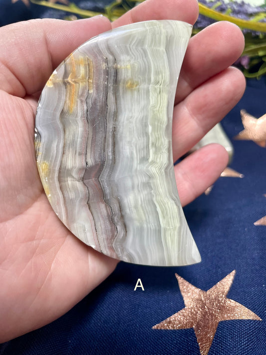 Natural Pink Banded Onyx Moon Crystal | Ornament | Pagan | Witchcraft | Wiccan | Polished | Gemstones | Reiki | ChakraBeautiful Pink Banded Onyx Moon Crystal You will receive 1 crystal and you can choose between A & B. A...