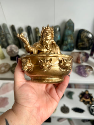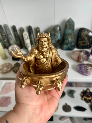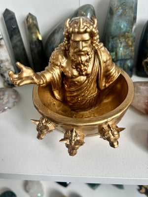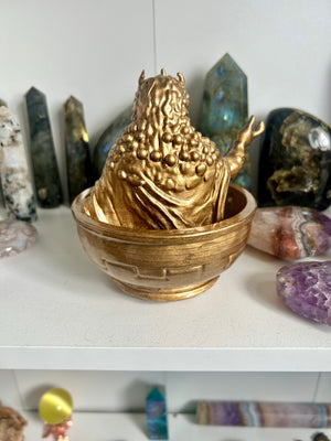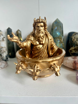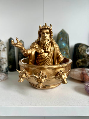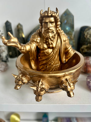 Honor the King of the Underworld with this striking 3D printed Hades offering bowl, designed to embody the powerful energy of the Greek god of death, wealth, and transformation. Meticulously printed and finished in a rich, metallic gold tone, this offering vessel features a commanding bust of Hades emerging from the center, surrounded by fierce three-headed hound motifs—an homage to Cerberus, his loyal guardian.