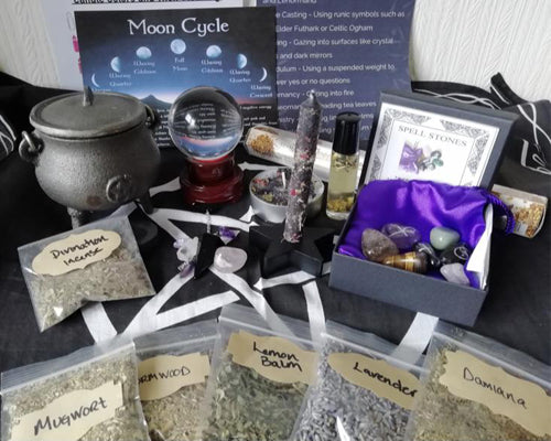 Included is a set of spell stones, small cauldron, glass scrying ball, pendulum, altar cloth, handmade divination incense, charcoal disc, hand crafted divination oil, hand rolled candle and large tea light both with herbs to help physic awareness whilst in your readings, spell candle holder, pack of incense, a few small crystals, moon chart and some herbs that can be used for scrying or made as a tea to help get you into a meditative/altered state.