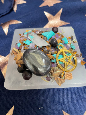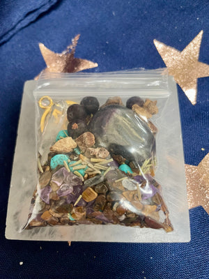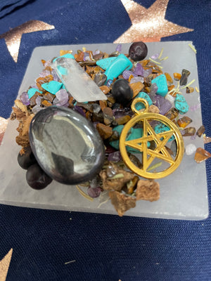 This pouch includes a mixture of chips including Tigers Eye, amethyst and Turquoise, it has a Pentagram charm, a Hematite tumble stone a small Quartz Point and some herbs.