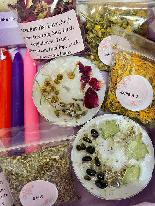 Witches Spell Candles & Herbs Supplies Gift Box | Candles | Incense | Wicca | Pagan | Witchcraft | Pillar Candles | Spells | Salts | BottlesThis set is perfect if you want a complete set of Spell candles & lots of herbs for your spell...
