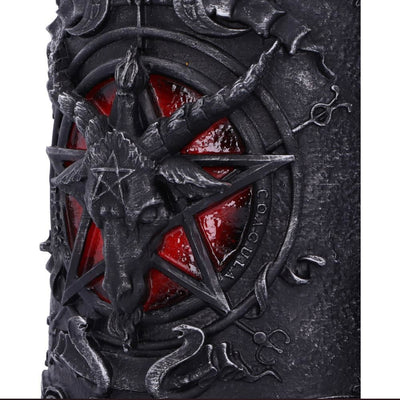 This occult tankard is a macabre lovers dream. Each side of the body has a small patent red background which sits under a raised pentagram, the words ‘Solve’ and ‘Coagula’ adorn its outer circle. Atop this the head of a triple-horned Sabbatic Goat with a pentagram raised from its skull. Above the head, a pair of crescent moons sit while below it, the heads of two King cobras are poised to attack. The handle is made from the Goat’s twisted horn which curls down to the base. Cast in the finest resin before being painstakingly hand-painted, this piece would make the perfect addition to any Gothic home and comes with a stainless-steel insert for ease of cleaning.