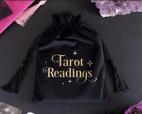 This velvet drawstring bag is the perfect place to keep tarot decks and oracle cards when not in use. Soft and luxurious with gold 'Tarot Readings' text on the front.