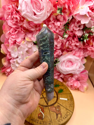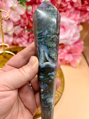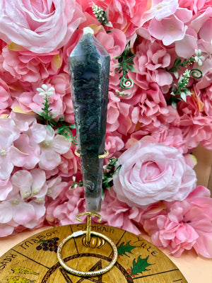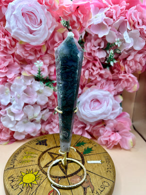 Overall, this druzy moss agate crystal wand on a stand is a beautiful and unique piece of decor that can add a touch of elegance to any room. It is a great addition to any crystal collection and can be used for meditation or as a decorative piece. The stand is a great way to display the wand in a way that is both functional and aesthetically pleasing.