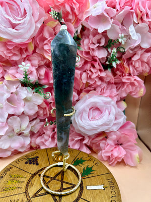 The stand for the druzy moss agate crystal wand is a great way to display it in a way that is both functional and aesthetically pleasing. The stand is made of a sturdy material that can hold the weight of the wand without wobbling or tipping over. The stand is also designed to be simple and elegant, making it a great addition to any decor style.