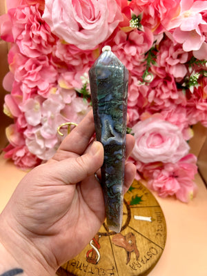 This druzy moss agate crystal wand is a beautiful and unique piece of decor that can add a touch of elegance to any room. The wand is made of druzy moss agate, a type of crystal that is known for its unique patterns and colors. The wand is on a stand, which allows it to be displayed in a way that is both functional and aesthetically pleasing.