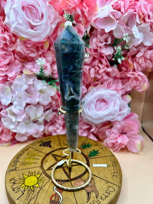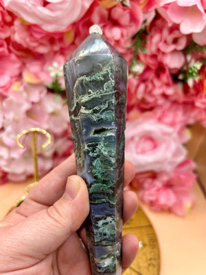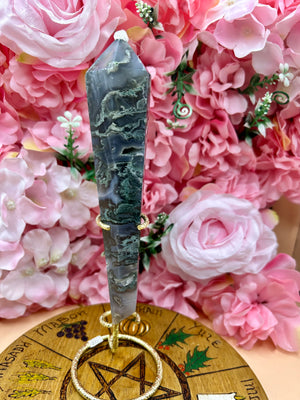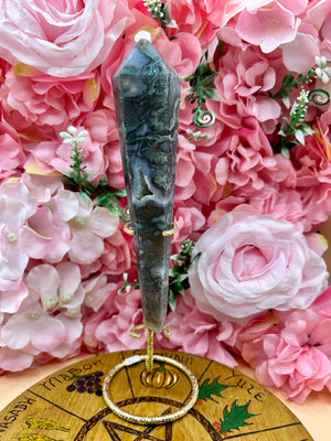Druzy Moss Agate Wand On Stand - Natural Gemstone Decoration