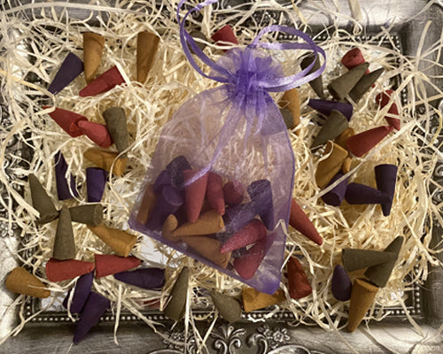 Organza Bag of 20 Incense Cones - Dragons blood, Cinnamon and Orange, Violet and Patchouli