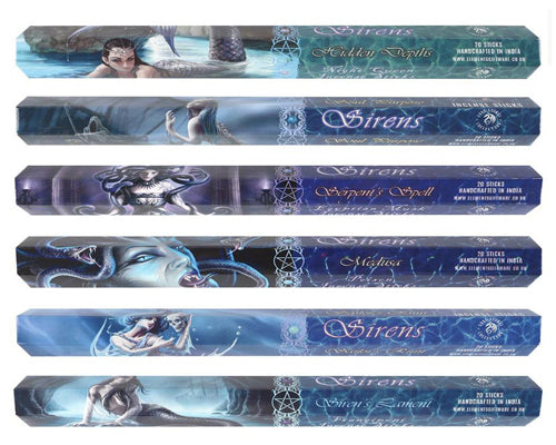 A gift pack from the Sirens Anne Stokes incense range. It includes 6 packs of incense, one of each Sirens scent. Each hexagonal pack contains 20 sticks of incense that will fill your home with mystical scents from the deep sea. Scents include Sailor's Ruin (jasmine), Hidden Depths (night queen), Siren's Lament (frangipani), Medusa (poison), Serpent's Spell (Egyptian musk), and Soul Purpose (lily).