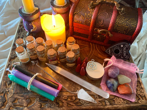 This is a beautiful set presented in a medium sized colonial chest, it has lots of different supplies to aid you in your craft. Also the perfect size to use as a Travel Altar.
