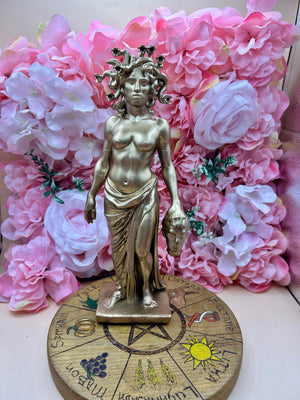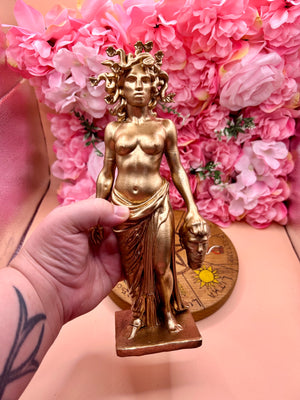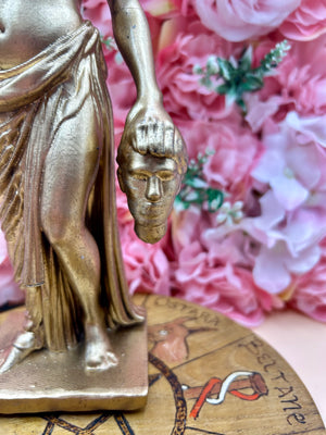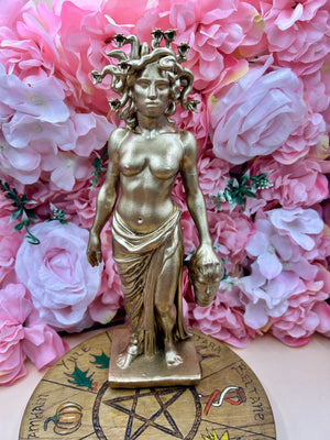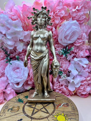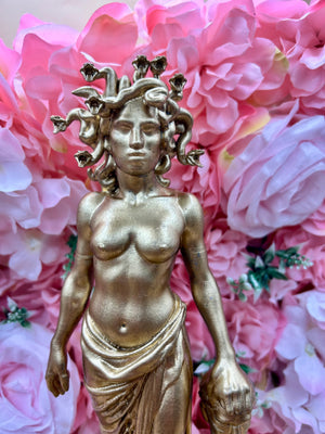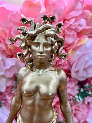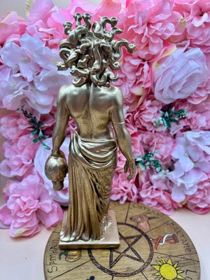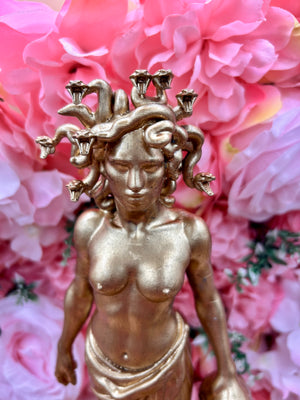 Invoke the fierce, protective energy of Medusa with this handcrafted 3D printed statue, perfect for altars, witchcraft rituals, or sacred decor. Medusa—goddess of transformation and guardian of feminine rage— emerges in Antiqued Gold holding the severed head of her oppressor, snakes adorn her hair.