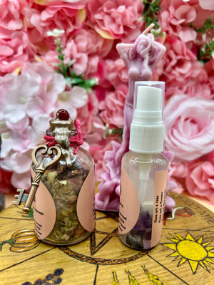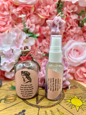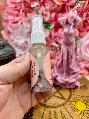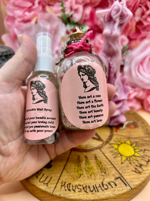 The room spray is filled with crystals and essential oils associated with the goddess.