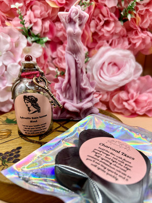 The resin incense blend is filled with herbs and resins associated with the goddess. This set comes with 4 Charcoal disks to burn the incense on top of.