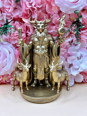 This is an absolutely beautiful statue that I have designed myself to honour the god of witches. He holds a staff in one hand and a fire torch in the other adorned with a pentagram. Two deer accompany him by his feet. The space between the deer is a great space to place any offerings.