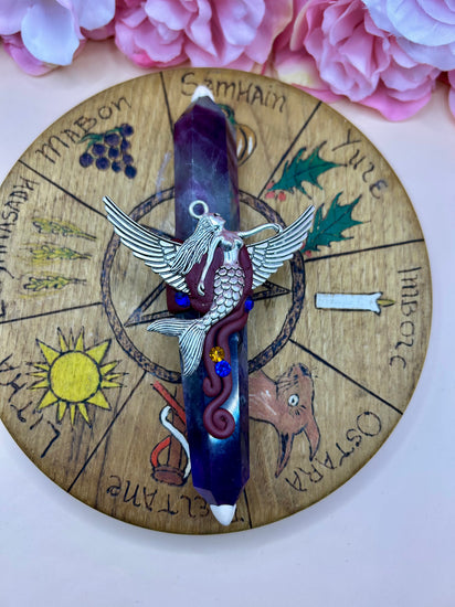 Fluorite Mermaid Wand: Winged Charm, Rhinestone Accents - Ritual Tool