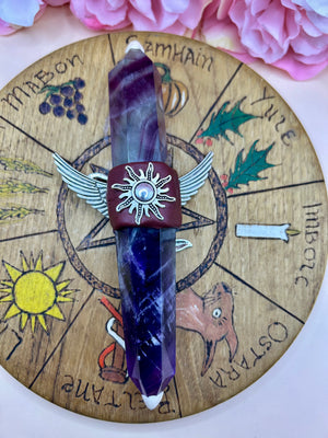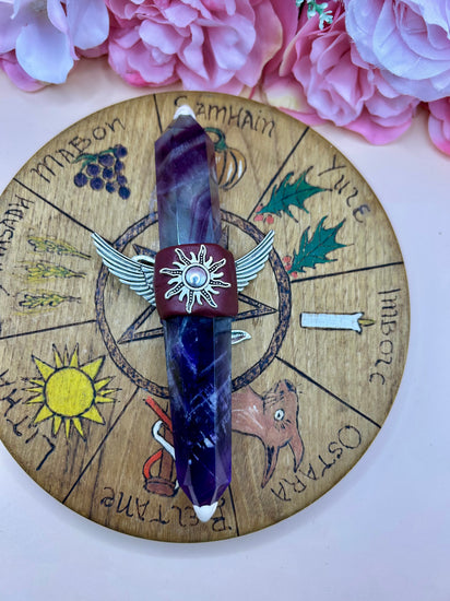 Carved from rich, banded Purple Fluorite, this wand is known for: