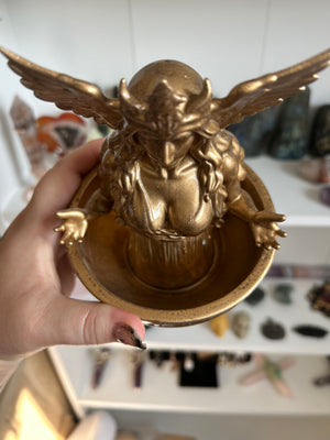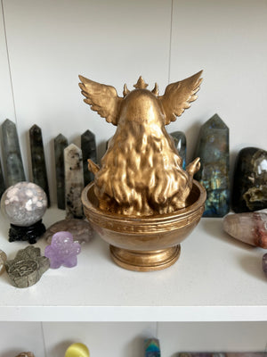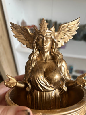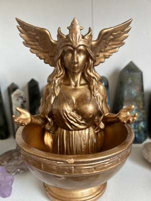 Hand-cast in a shimmering golden finish, this statue features Freya with flowing hair, open hands, and majestic winged headpiece — seated within a ceremonial bowl, ready to receive your offerings of herbs, crystals, flowers, or intentions. Perfect for any Norse pagan altar, witchcraft space, or sacred ritual work.