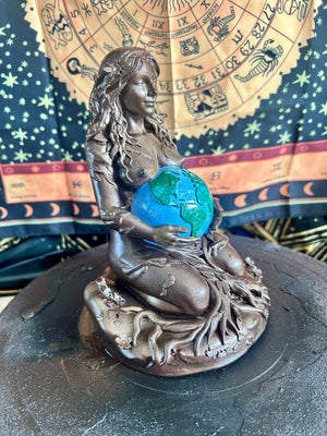 Crafted from high-quality resin and 3D printed with intricate detail, this piece features flowing hair, entwined roots, delicate flowers, and a hand-painted globe representing our beautiful planet. The bronze-style finish gives it a timeless, ancient energy β perfect for altars, meditation spaces, or spiritual home dΓ©cor.