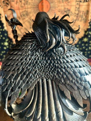 Crafted with incredible detail, this powerful depiction of The Morrigan stands with flowing hair, raven companions at her feet, and a crescent-topped staff β symbolising prophecy, transformation, and divine feminine power. Her wings curve protectively around her, embodying both destruction and fierce protection.