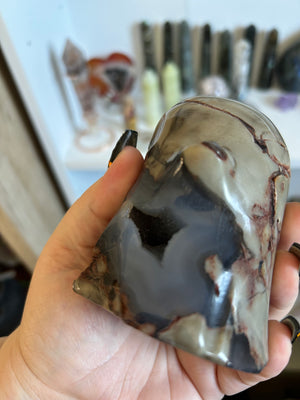 Invite a touch of mystical charm into your space with this stunning volcano agate ghost carving. Hand-polished to a glossy shine, this spectral companion features swirling layers of smoky gray, cream, and earthy red tones, resembling molten lava frozen in time. Its natural banding and inclusions give it an ancient, enchanted energy — no two angles look the same!